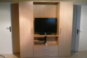 Kleiderschrank mit reichlich Kleiderbügeln, SAT-TV über großen Fachbildschirm, einsehbar von Couch, Bett und Essbereich.