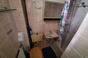 Bad mit Dusche/WC mit Waschbecken, Spiegelschrank, Heizkörper und Handtuchhalter.